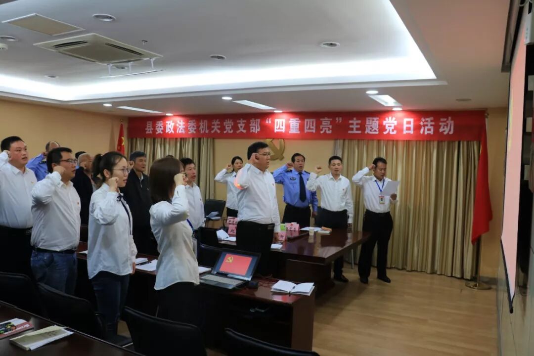 10月10日上午,县委政法委机关党支部开展“四重四亮”主题党日活动。县委政法委机关全体党员,退休老党员代表参加会议,县委主题教育第三指导组陈波列席会议。